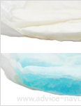 吸収体の断面図です。 吸収体の中でも中央部分を強化しているのか、吸収体の真ん中が特に厚かったです。※色水に使った量は60mlです。 |