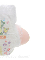 | 脚まわりです。 ギャザーはしっかり赤ちゃんの脚にフィットするようにあててください。内側に折れていると、モレの原因などになります。 |